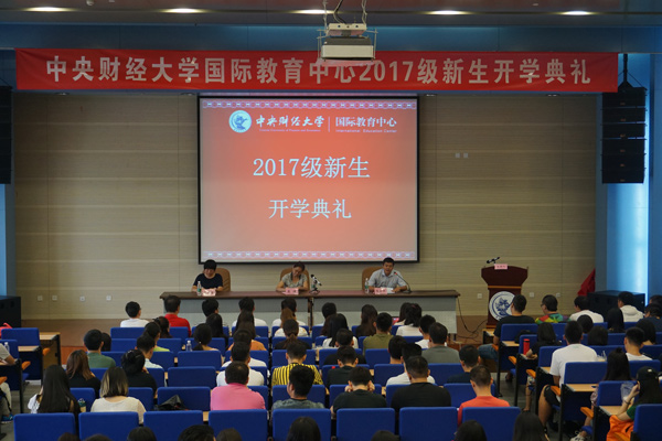 2017年8月31日上午9:00,中央财经大学国际教育中心2017级新生开学典礼于学术会堂402报告厅隆重举行。学院领导陈士平副院长、吴靖教授及国际教育中心全体教师出席了典礼,段冉老师主持典礼。2017级IPMC硕士预科,TUFC本科预科,新南威尔士大学预科,德国预备班,意大利预备班,西班牙预备班和日本预备班近170名新生参加了开学典礼。