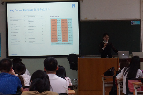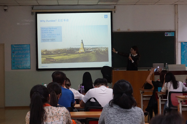 2017年9月19日16:30,邓迪大学(University of Dundee)校方代表即中国办公室陈老师来访中央财经大学国际教育中心,在中央财经大学学院南路校区204教室为国际教育中心师生就邓迪大学地理位置、环境、学院设置、优势专业、毕业生的评价及招生政策等进行了详细介绍。